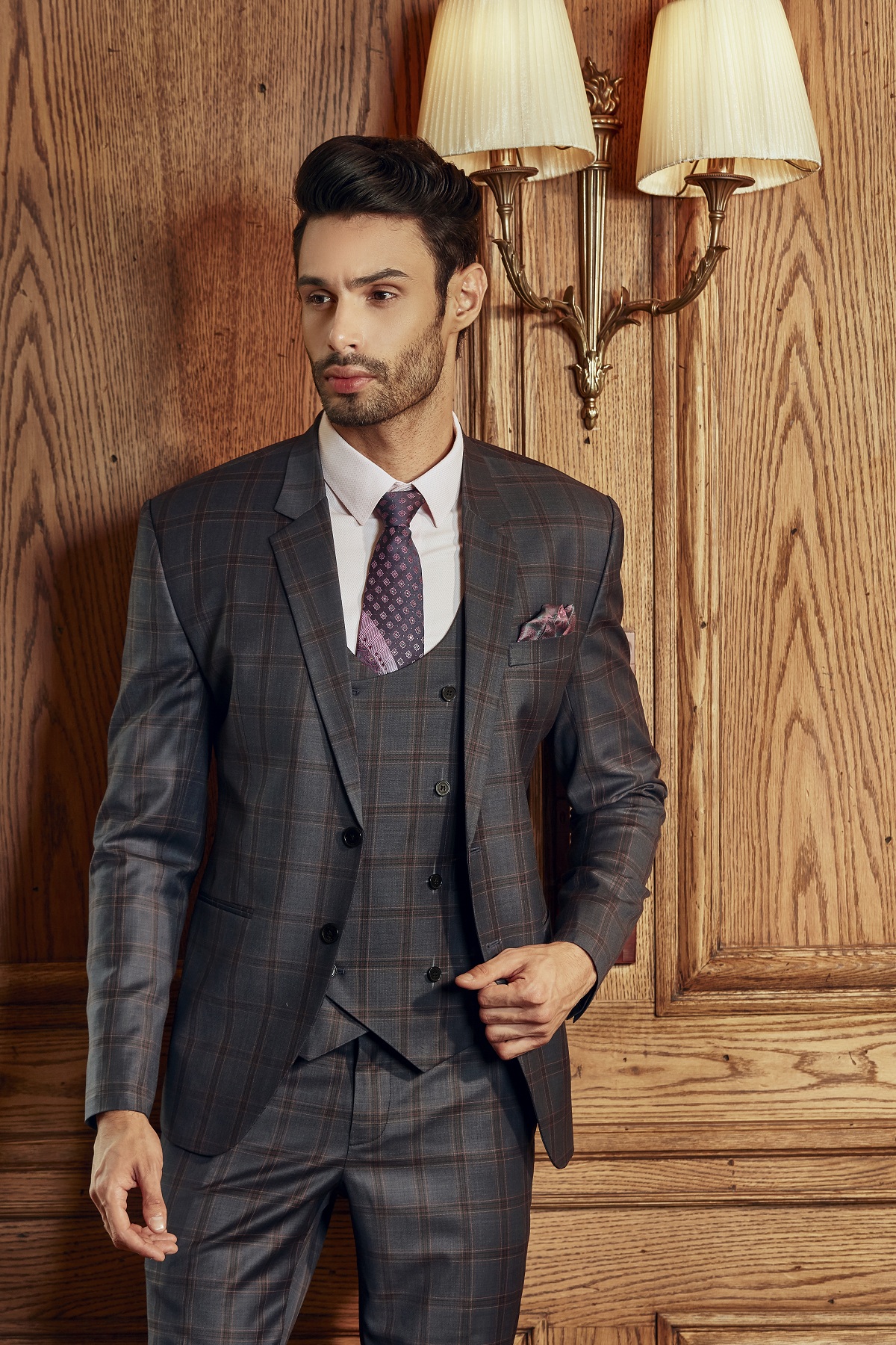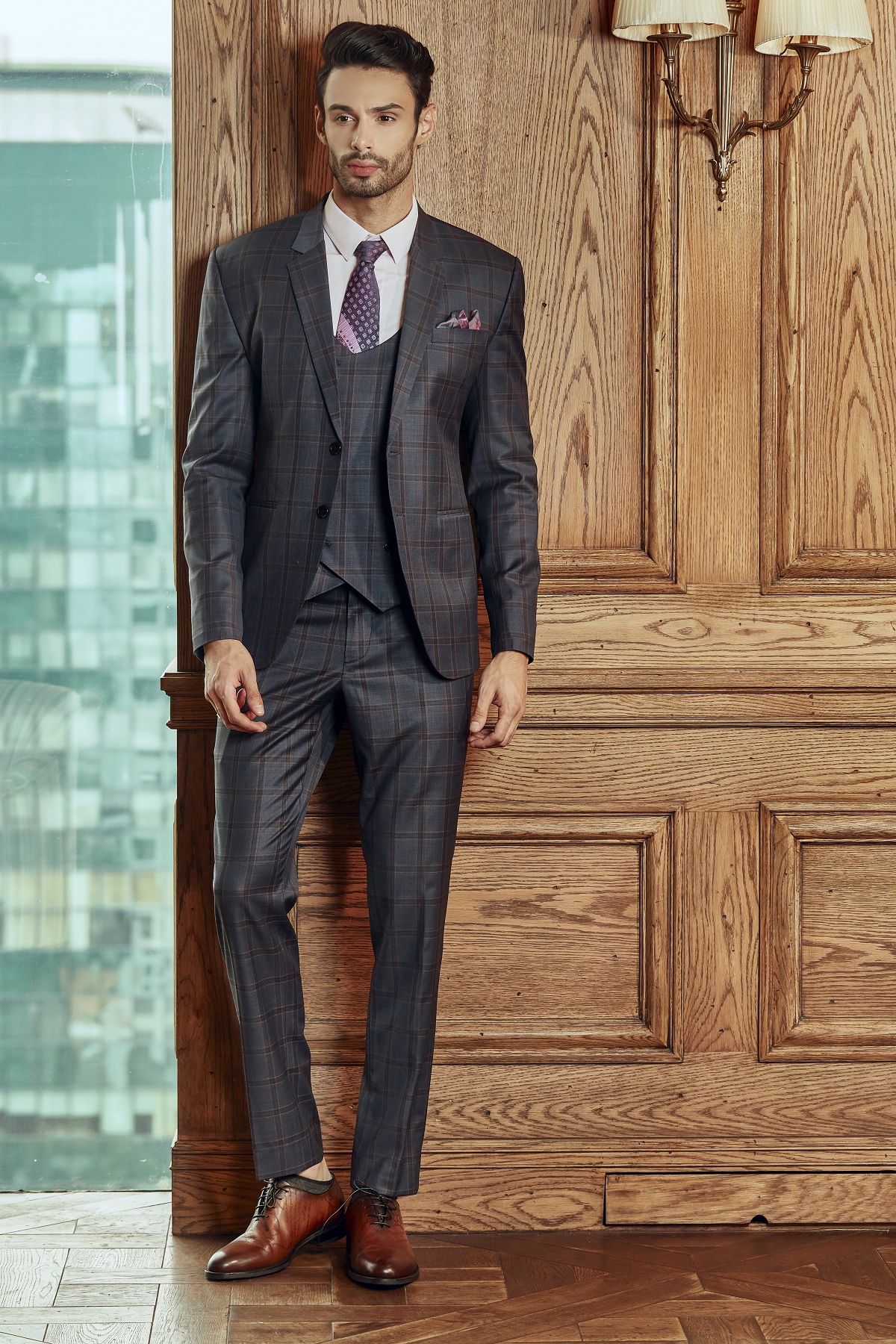 VEST 3 MẢNH BROWN PLAID GREY CAO CẤP